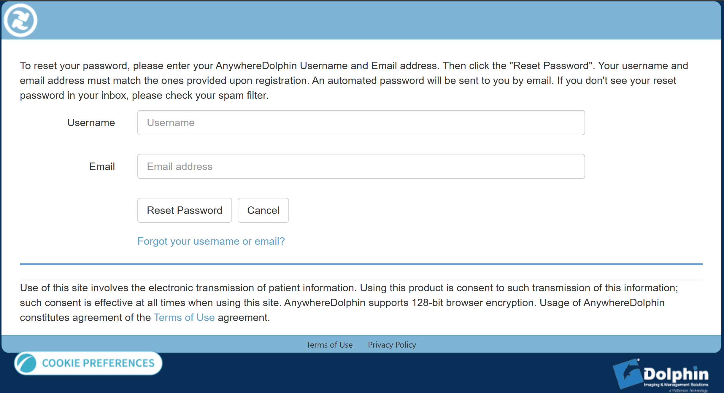 To reset your password, enter your Username (your default username will be “FirstnameLastname”, for example DavidSmith), enter the email used in your initial Patient paperwork, and click the “Reset Password” button.